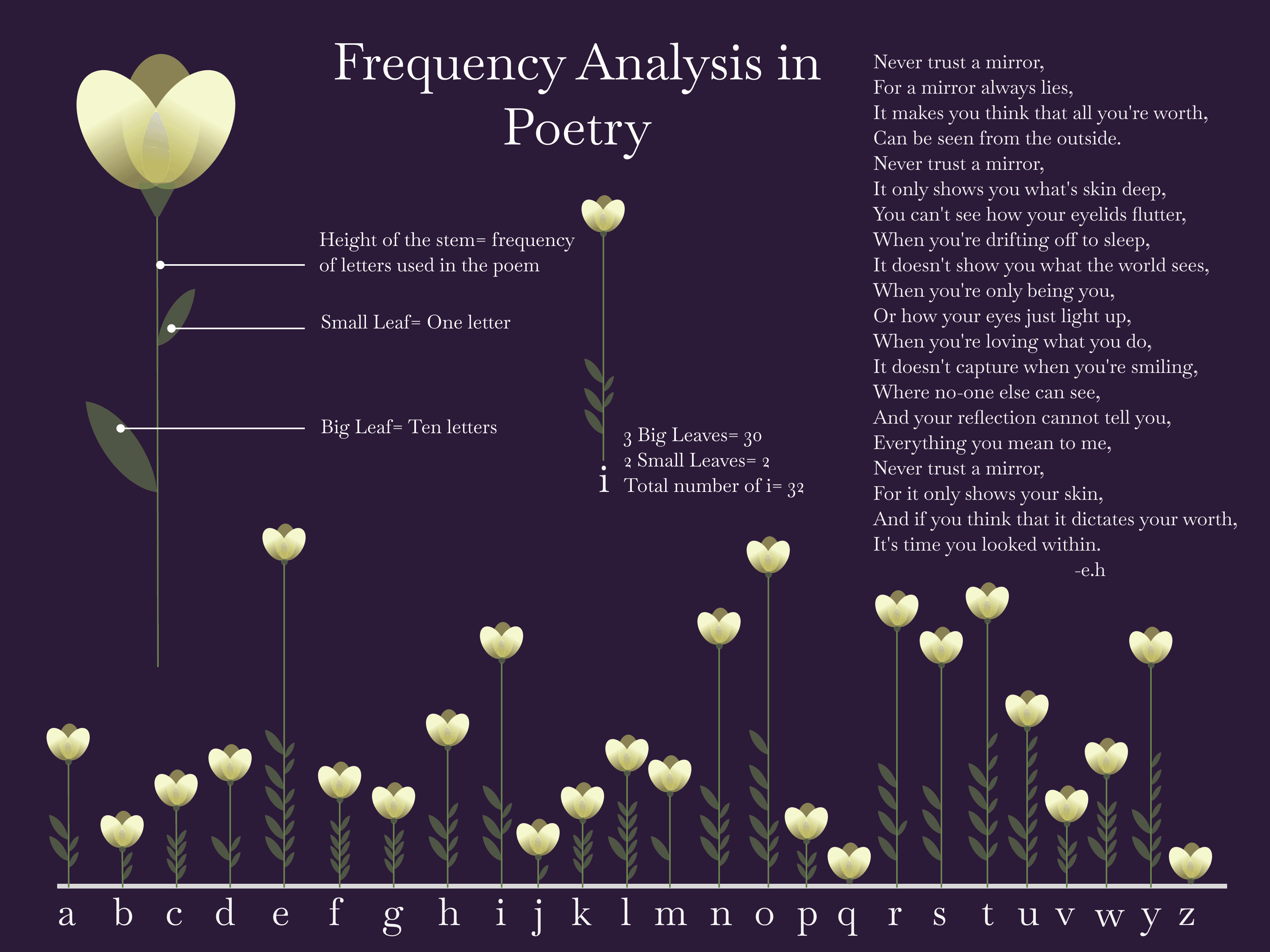 Each flower represents a letter, with stem height showing how often it appears in the poem. Small leaves indicate single counts, while large leaves represent groups of ten.