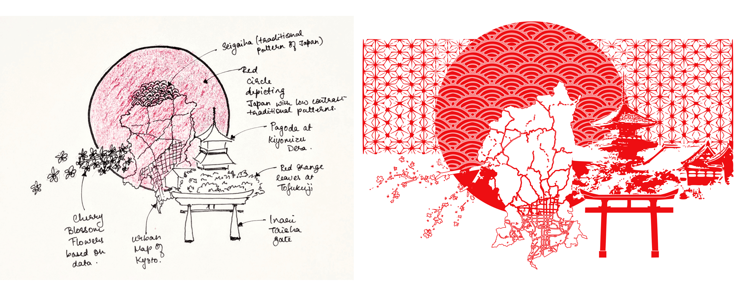 Starting with Kyoto, I researched its architecture, landmarks, and textures to capture the city's layered cultural identity. I first created a concept sketch to map out the composition, then translated it into a red-and-white illustration with the city’s key landmarks, materials, and textures that define Kyoto’s identity.