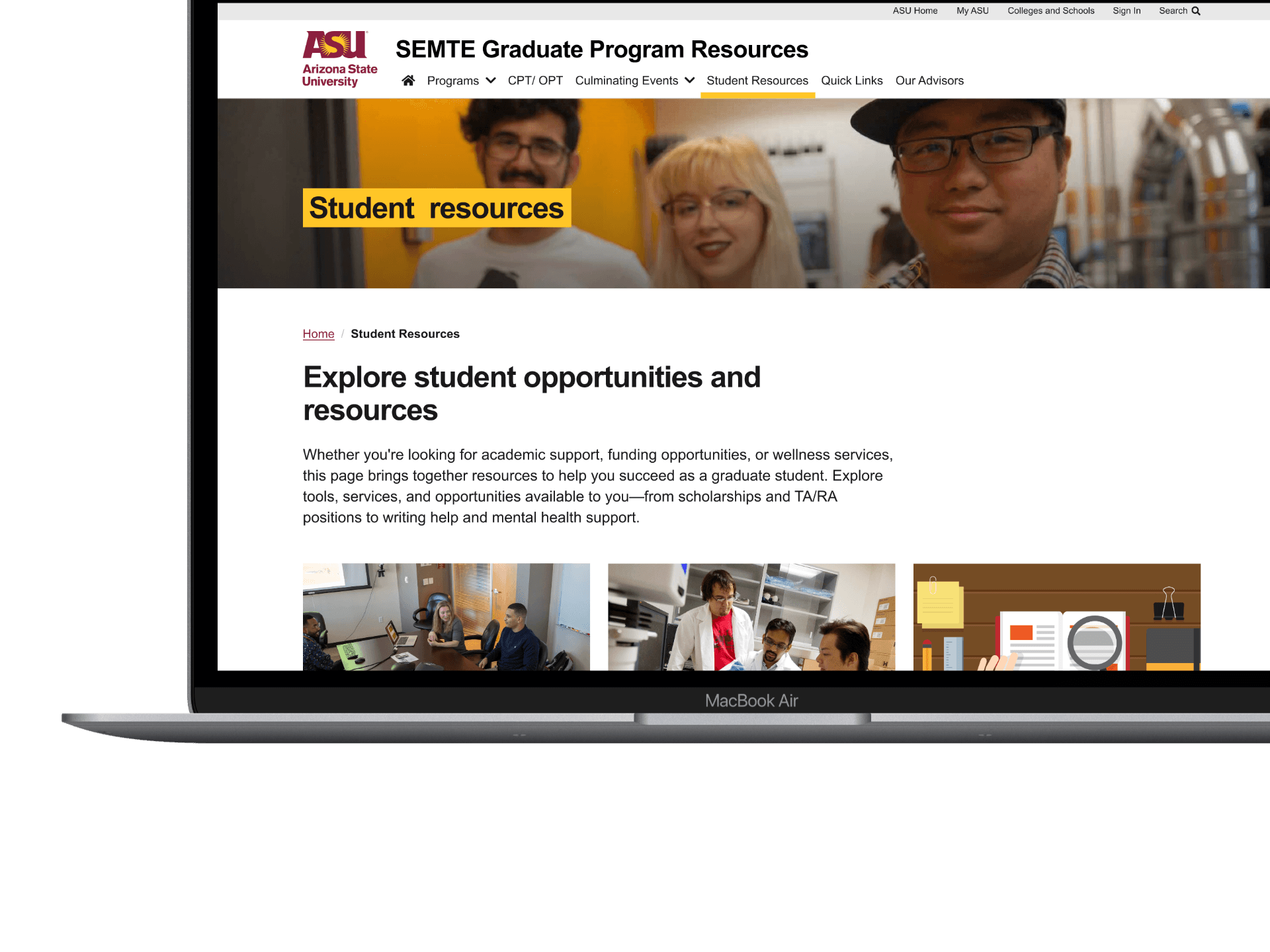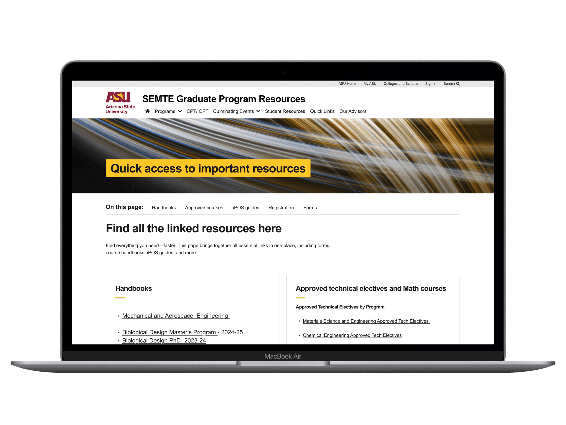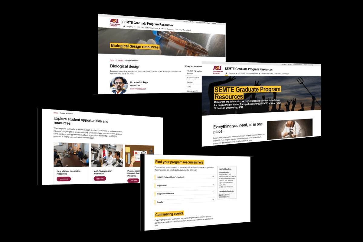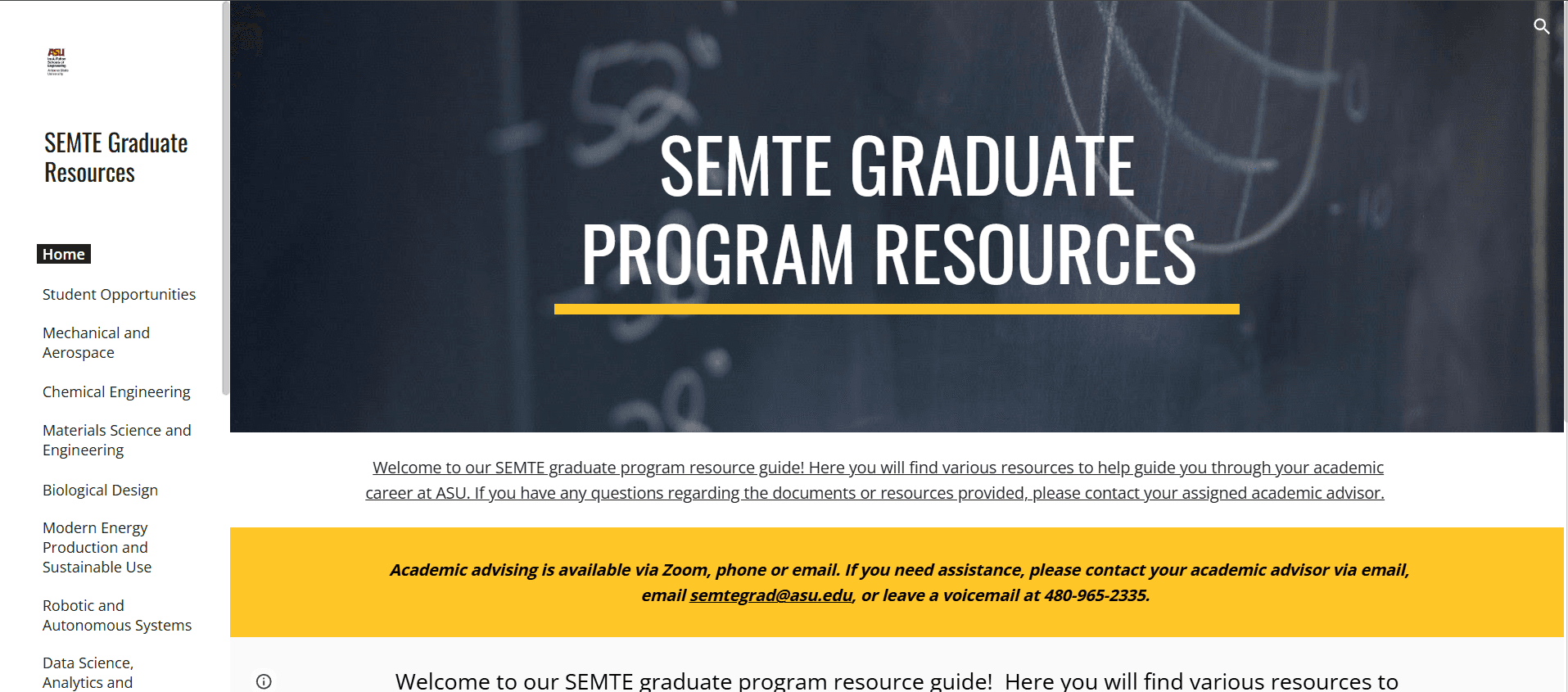 The SEMTE Graduate Resources website serves graduate students and advisors across multiple engineering programs at ASU, to provide accessible information about academic procedures, student opportunities, policies, and tools to support successful program navigation.