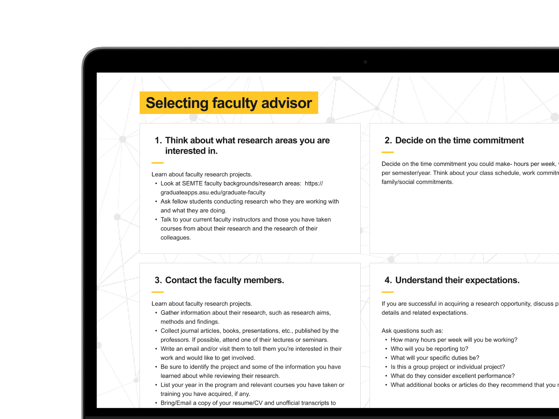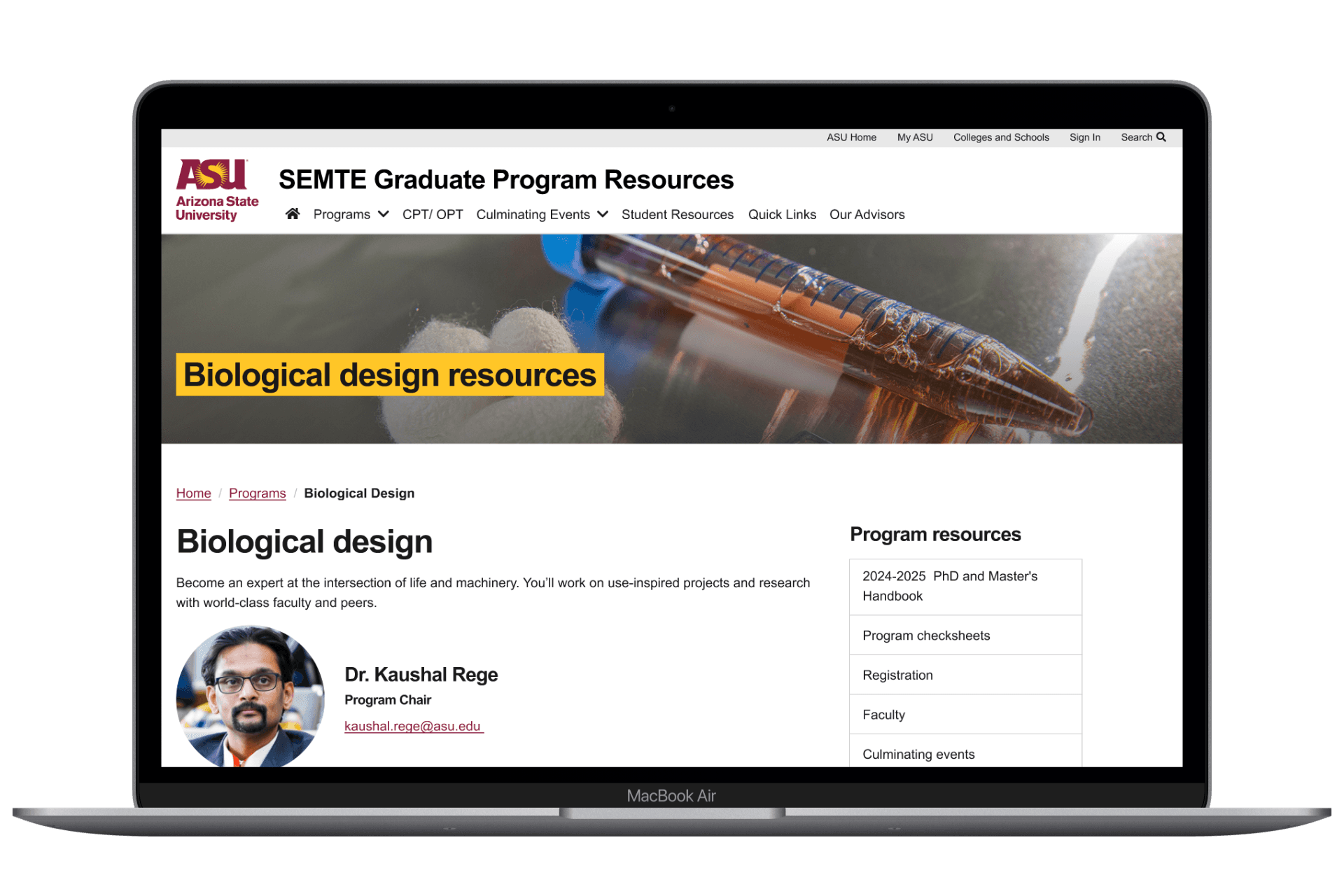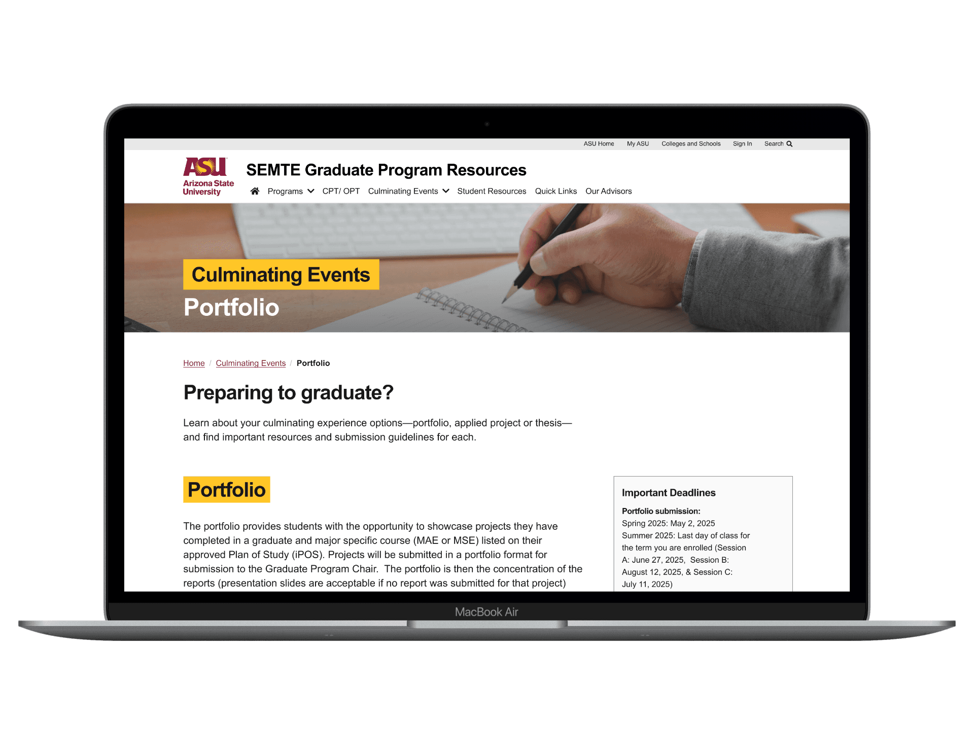 The SEMTE Graduate Resources website serves graduate students and advisors across multiple engineering programs at ASU, to provide accessible information about academic procedures, student opportunities, policies, and tools to support successful program navigation.