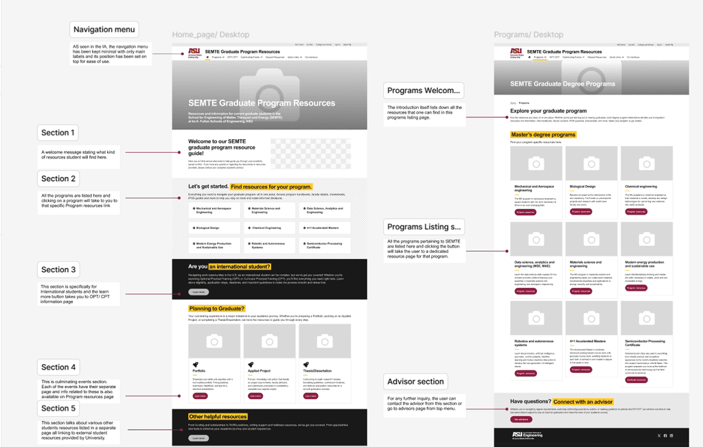 To translate the research insights into a clear and structured design direction, I began by developing low- and mid-fidelity wireframes using the ASU Unity Design System — a university-wide framework built to ensure visual consistency, accessibility compliance, and cohesive user experience across all ASU digital platforms.