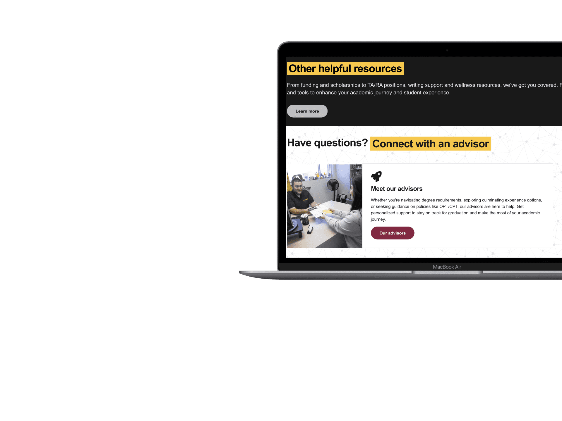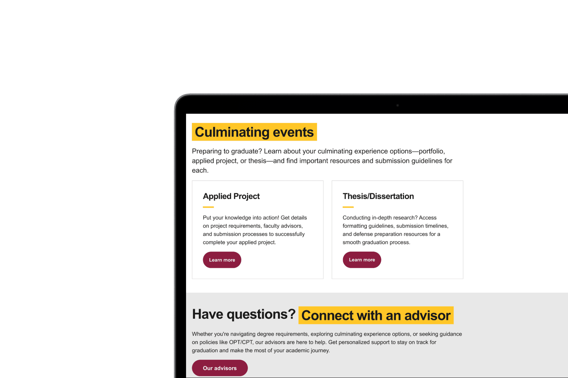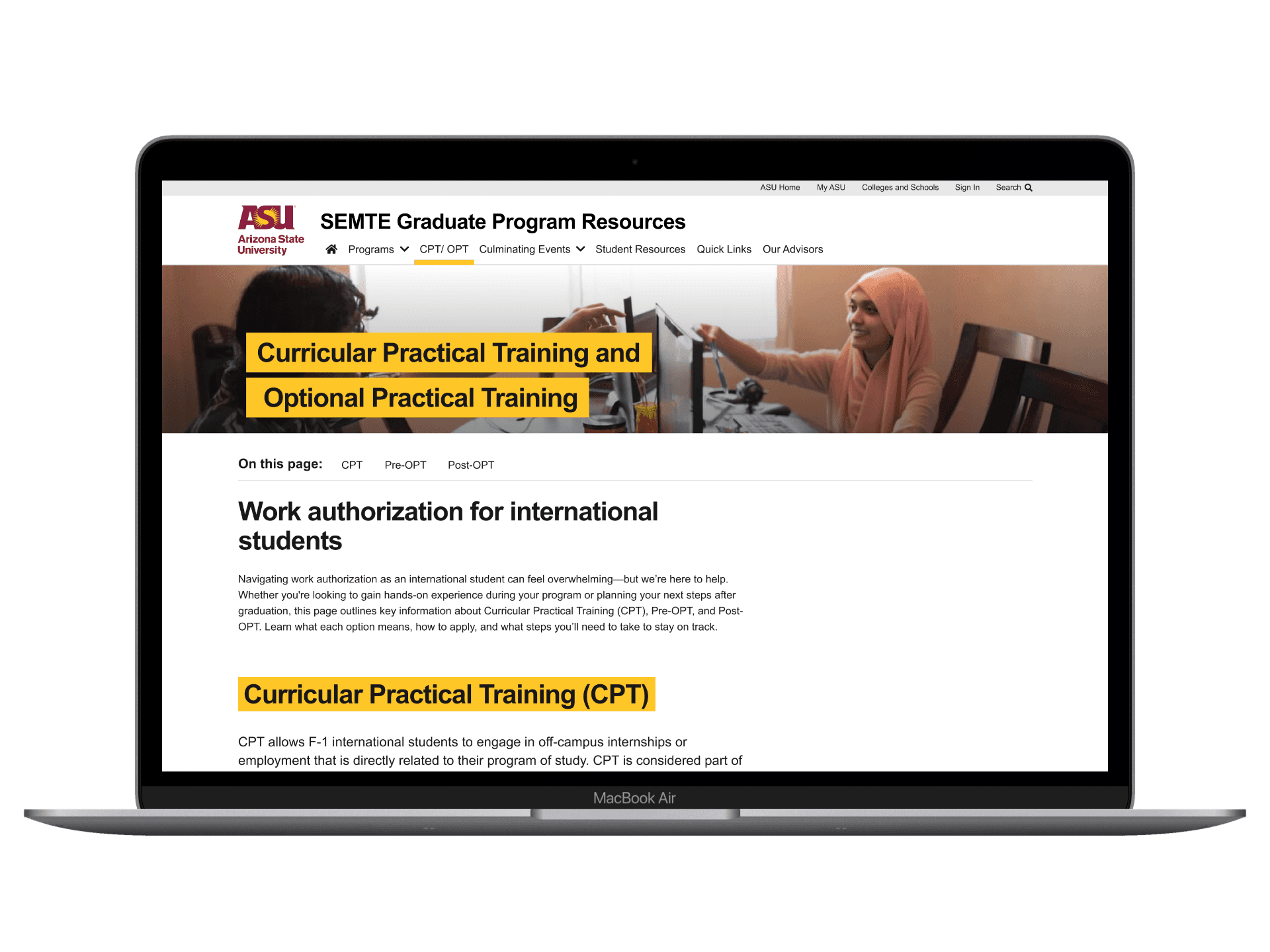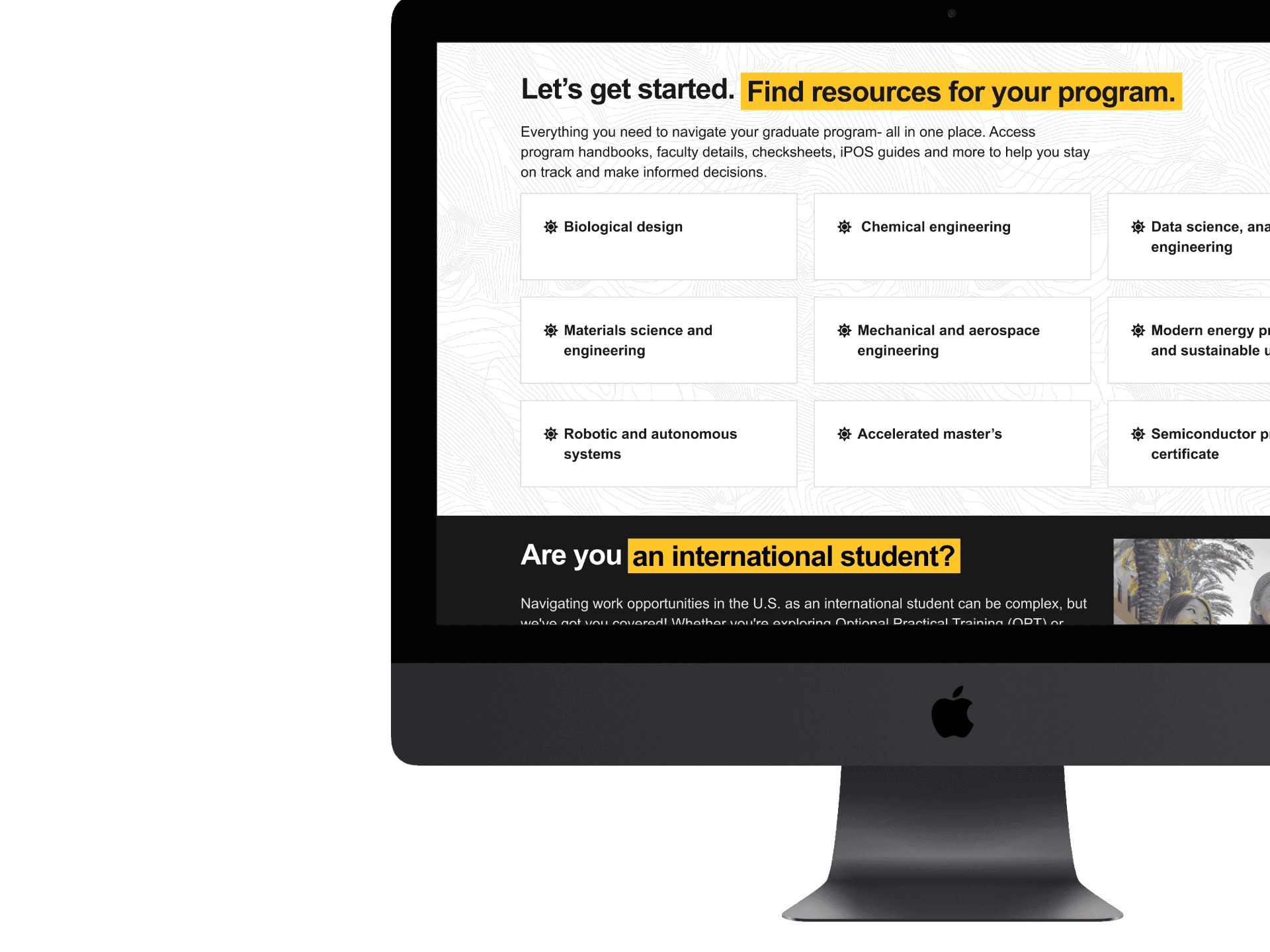 Improved findability of key information such as program requirements, CPT/OPT policies, and graduation steps.