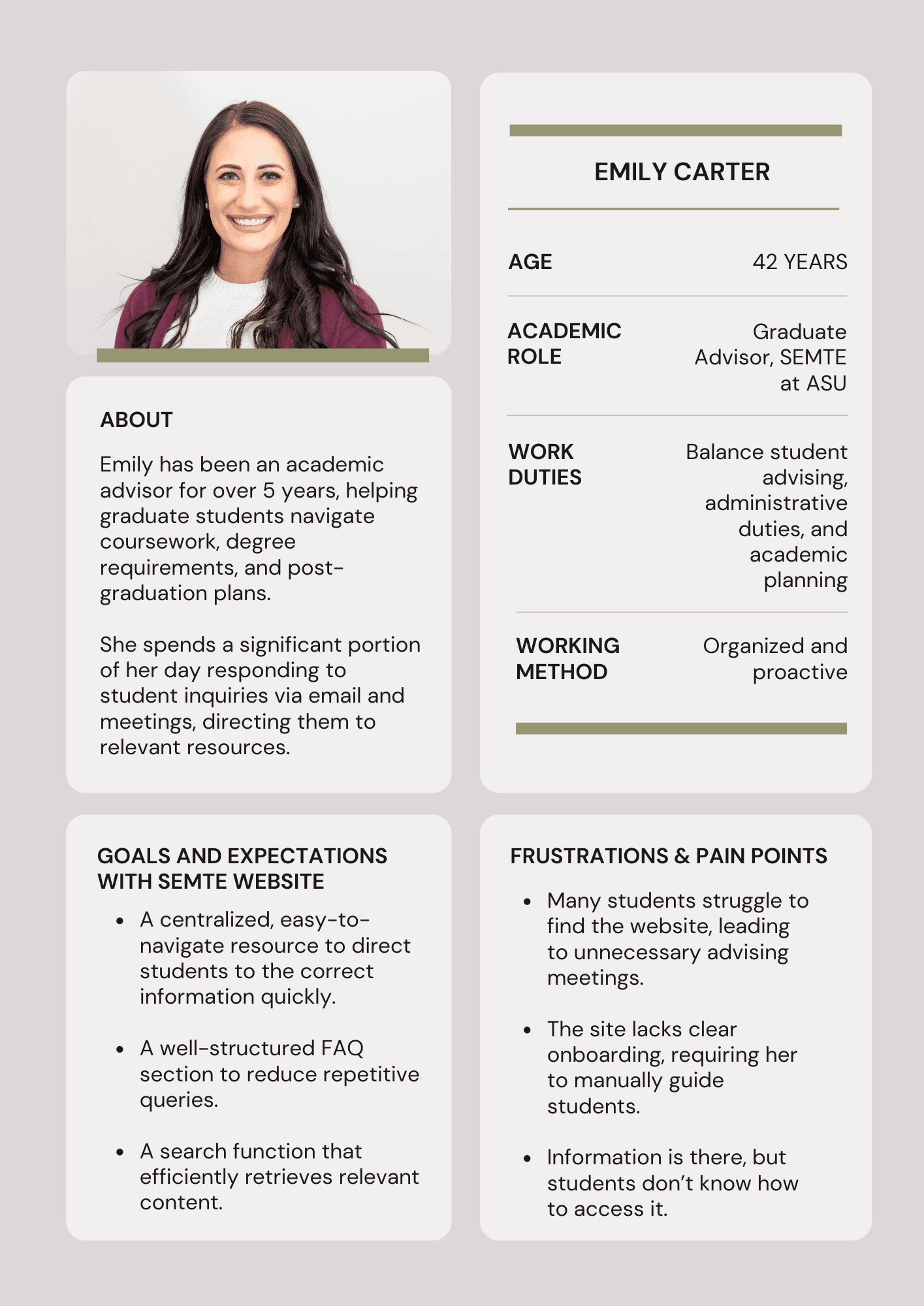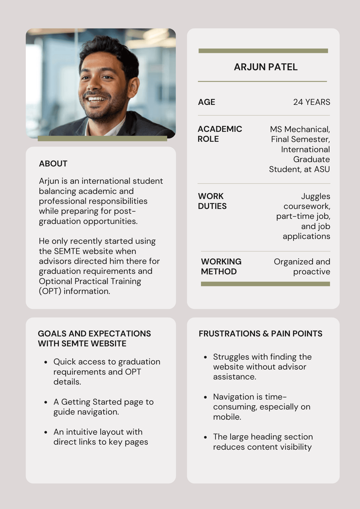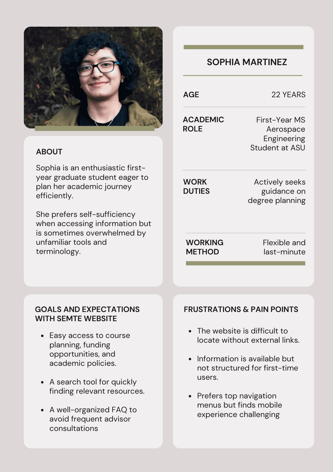 Based on the insights gathered from the survey and user interviews, I developed three key personas representing the primary user groups of the SEMTE Graduate Resources website- current graduate students in first year, Current graduate students who are about to graduate and SEMTE Graduate Advisors.