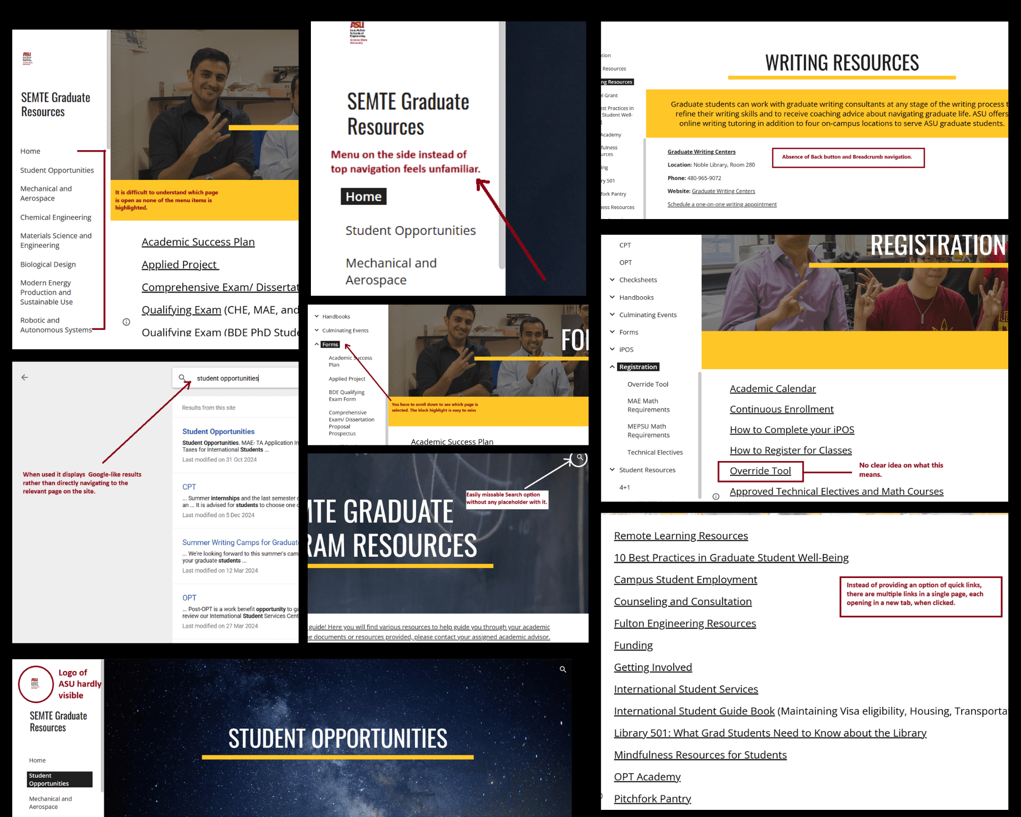 The existing SEMTE Graduate Resources website lacked a cohesive structure and intuitive navigation system. Key information was buried under inconsistent page layouts, redundant links, and fragmented categories, leading to user frustration and poor discoverability of critical academic and advising resources.